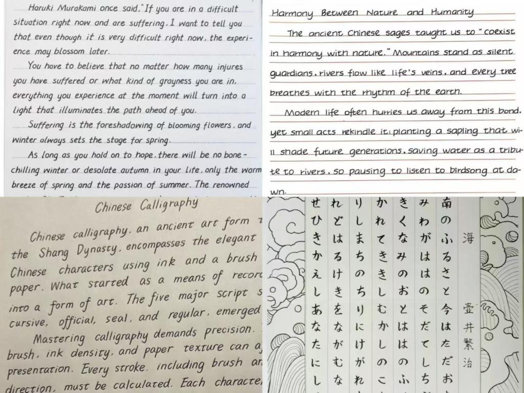 外文书法作为中外文化交融的独特载体,既融汇汉字书法的笔墨意趣,又展现出不同文字特有的书写魅力。比赛自启动以来,吸引了上百名热爱书法的同学积极参与,涵盖英语、德语、日语、韩语等多个语种,呈现了一场兼具国际视野与艺术美感的文化盛宴。