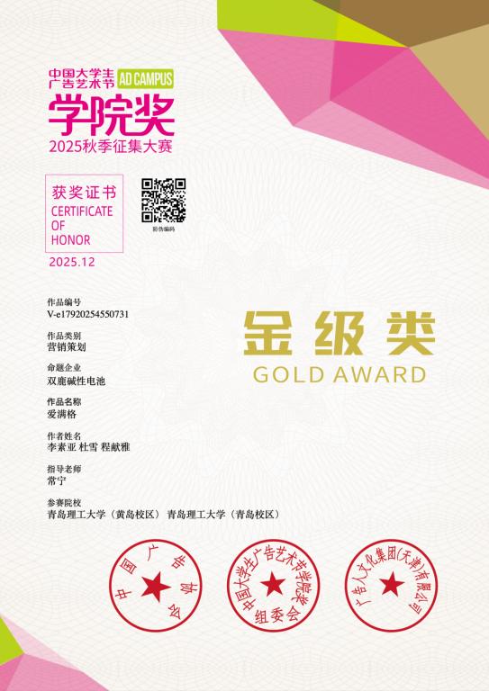 由常宁老师指导,新闻与传播专业硕士研究生李素亚、杜雪、程献雅共同完成的营销策划作品《爱满格》,在双鹿碱性电池赛道中脱颖而出,荣获全国金奖。该作品围绕品牌特性展开策划,以情感化、场景化的创意传达产品“电力持久”的核心卖点,体现了扎实的专业素养与敏锐的市场洞察力。