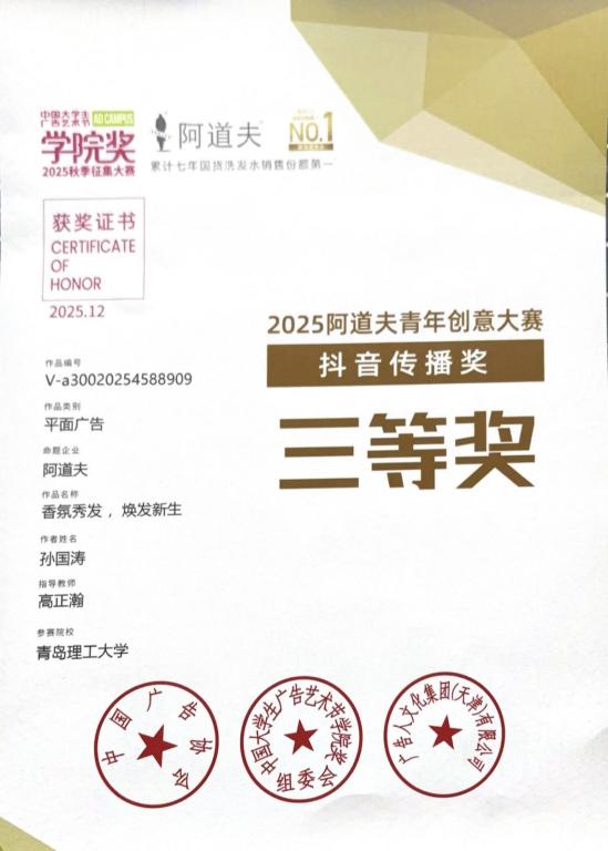 由高正瀚老师指导,网络与新媒体专业25级学生孙国涛创作的平面广告作品《香愈洗发,焕发新生》,在2025阿道夫青年创意大赛赛道中,以“香氛”与“焕新”为概念切入点,突出洗发产品的独特使用体验,凭借出色的抖音传播创意与执行效果,荣获抖音传播奖全国三等奖。