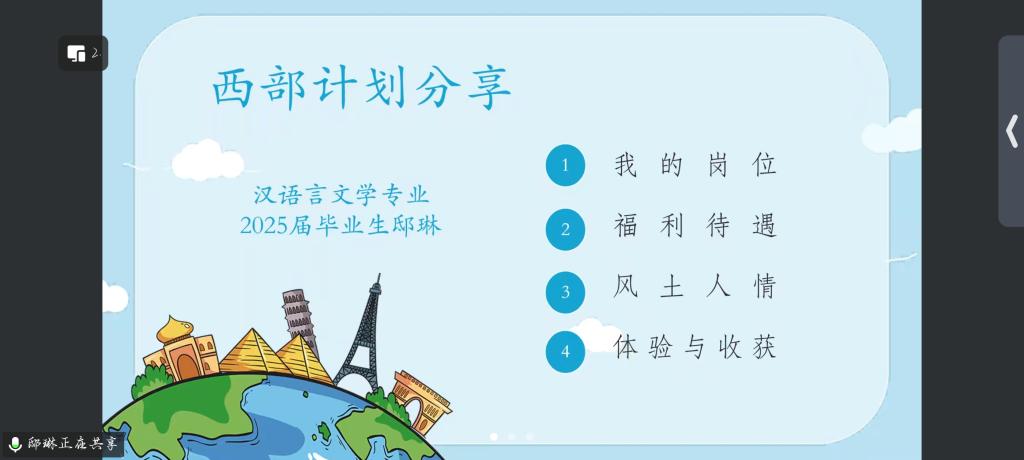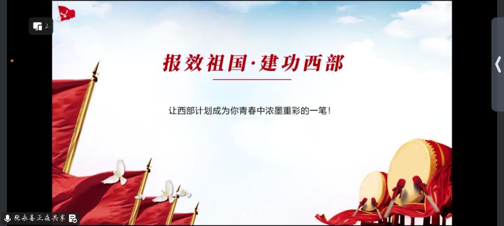 在经验分享环节,学院特别邀请了两位正在西部服务的校友代表作线上交流。2025届西部计划志愿者、2022级社会工作专业硕士研究生张永喜,以及2021级汉语言文学专业本科生邸琳,结合各自在新疆维吾尔自治区和新疆生产建设兵团的服务经历,生动讲述了当地的风土人情、日常工作任务、生活保障及成长收获。她们用朴实的语言和真挚的情感,展现了西部基层工作的真实图景,并鼓励学弟学妹们勇敢迈出服务西部的第一步,在实践中书写无悔青春。