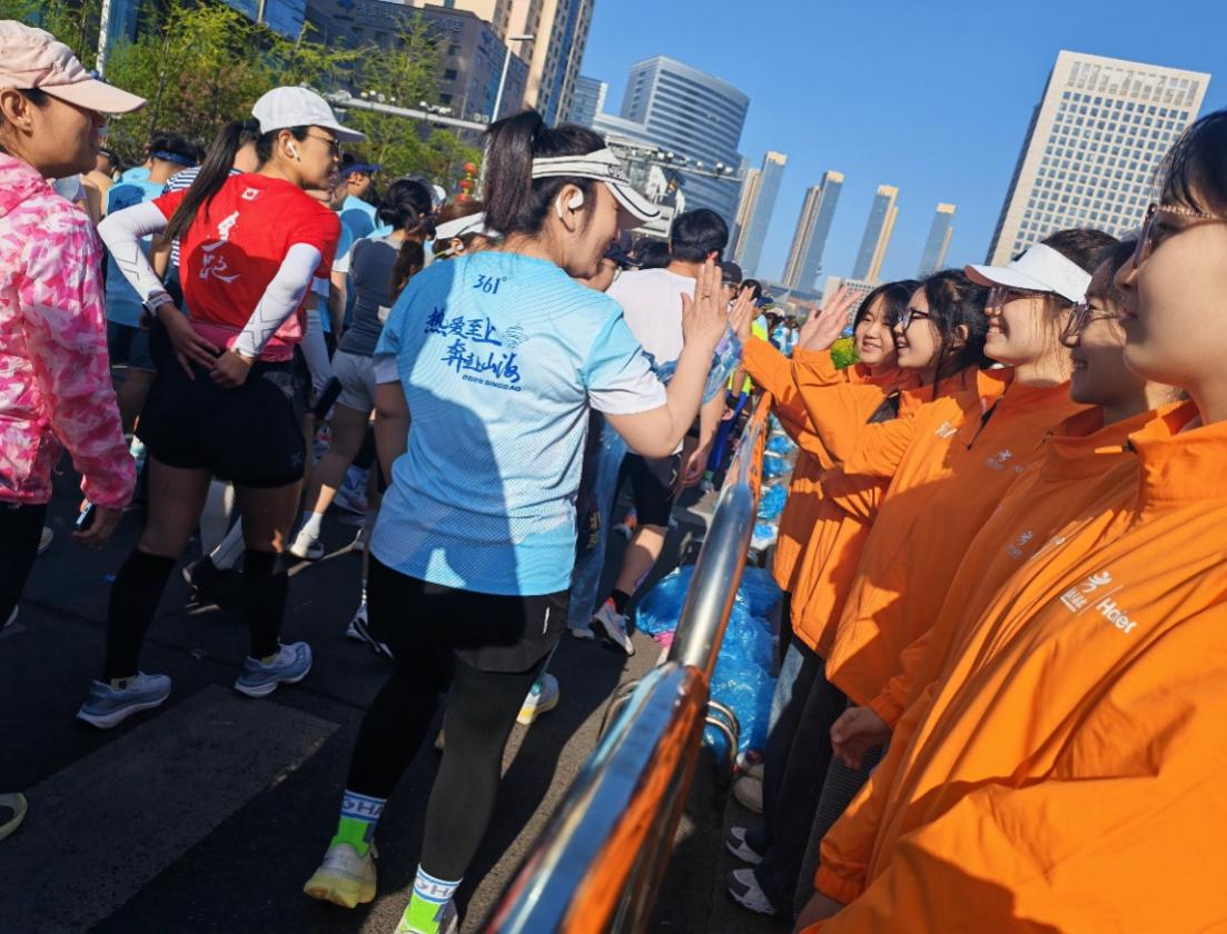 起点处,检录志愿者高效核验选手信息,为赛事安全守好第一道关卡。随着比赛推进,5公里和7.5公里补给站迎来客流高峰。志愿者们分工明确、配合默契,快速有序递送饮用水、能量饮料、降温海绵等物资,同时为选手呐喊助威。从凌晨微光到日上三竿,连续数小时的站立值守、重复操作,没有一位志愿者抱怨叫苦。2024级翻译专业硕士研究生焦筱萌学生激动地表示:“当看着奔跑的选手们带着汗水从面前经过,接过补给时一句真诚的感谢,一个肯定的点头、一次温暖的击掌,所有凌晨早起的困倦、长时间站立的酸痛,都在这一刻烟消云散。”