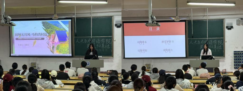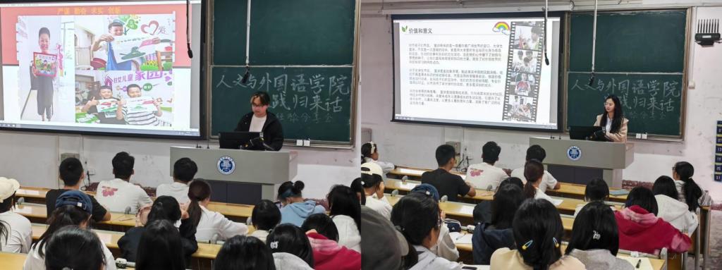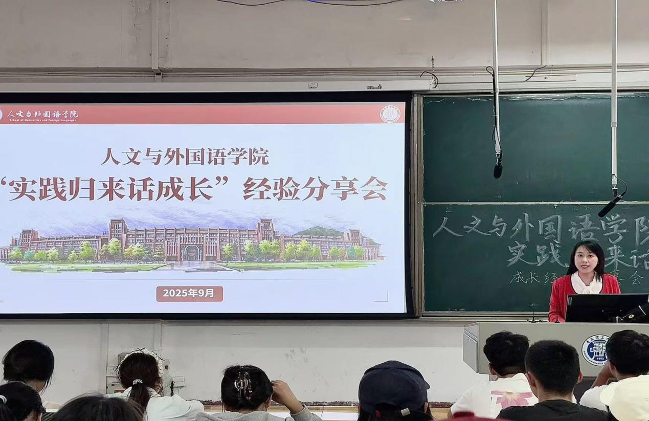 为深化实践育人和“大思政课”工作成效,引导青年学生在社会实践中“受教育、长才干、作贡献”,9月26日,人文与外国语学院在市北校区1教一阶教室举办2025年“实践归来话成长”暑期社会实践主题分享会。学院团委书记胡彤、辅导员刘文帅、各年级社会实践骨干成员及2025级新生共计130余人参加了本次活动。