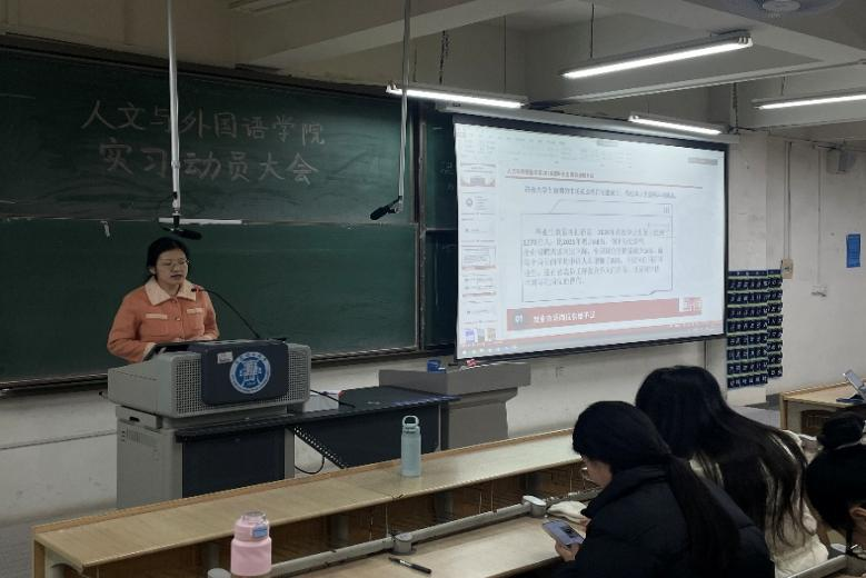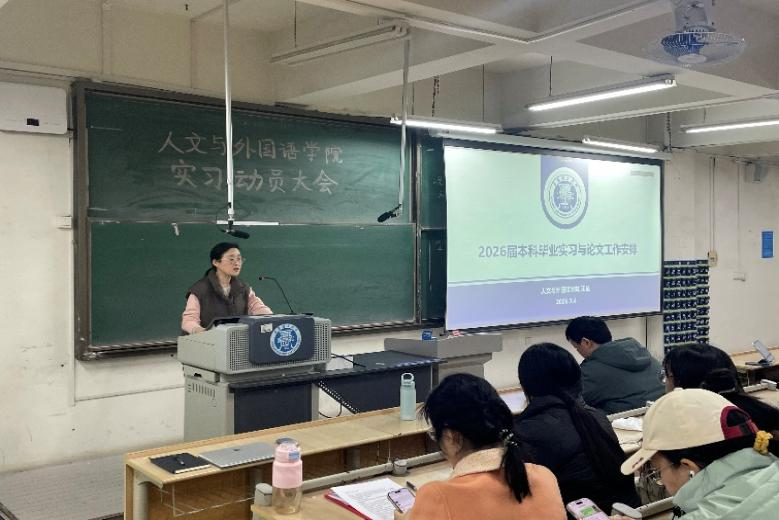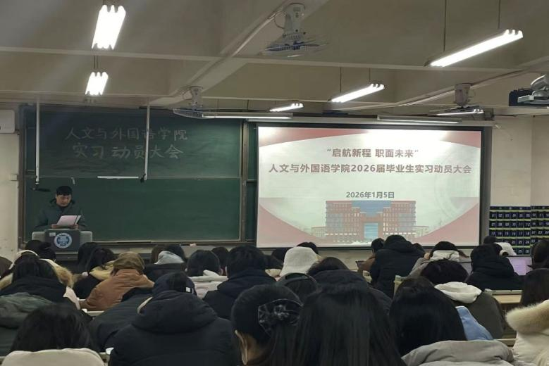 为扎实推进2026届毕业生实习与就业工作,加强本科毕业论文全过程管理,保障毕业各环节顺利开展,人文与外国语学院于1月5日下午在主教学楼B211组织召开2026届毕业生实习就业动员大会。学院党委副书记、副院长李军权,副院长王星,2026届毕业生辅导员李佳,班主任贾舒文及全体在校毕业生参加会议。会议由贾舒文主持。