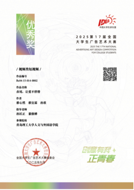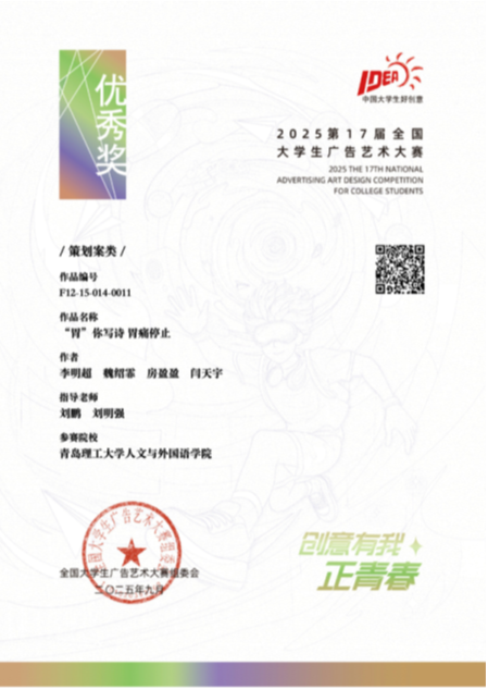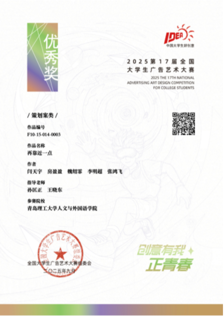 近日,第十七届全国大学生广告艺术大赛获奖名单揭晓,我院网络与新媒体专业学生再次斩获佳绩。由孙匡正、刘鹏、綦修婵、王晓东、刘明强等教师指导的学生作品(蔡心然、蔡宜霖、孙欣、李明超、魏绍菲、房盈盈、闫天宇、张鸿飞等),获得国家级优秀奖3项、省级一等奖1项(赛道第一名)、省级二等奖1项、三等奖4项和优秀奖18项,获奖数量刷新历年参赛最好成绩。