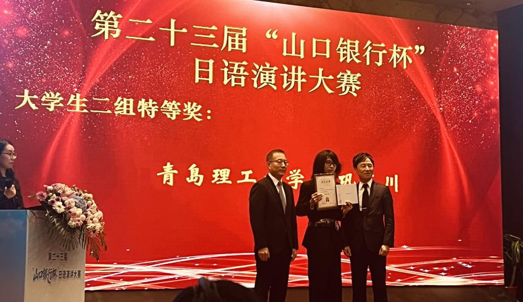 11月15日,由青岛市人民政府外事办公室、青岛市教育局及山口银行联合主办的第二十三届“山口银行杯”日语演讲大赛决赛暨颁奖仪式在青岛花园大酒店隆重举行,来自青岛市十三所高校的选手齐聚一堂,展开激烈角逐。我校日语专业的四位选手表现优异,荣获特等奖一项(2024级巩玉川)、三等奖一项(2023级金乙)、优秀奖两项(2022级石洪欣、2025级刘安妮)。