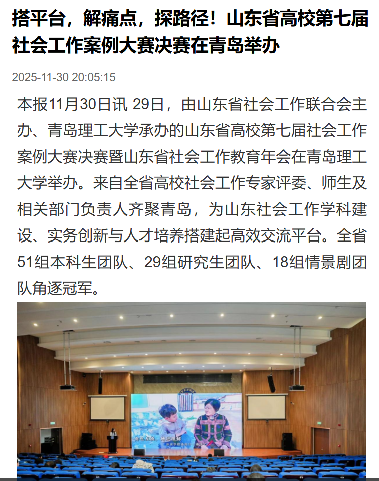 青岛财经网:山东省高校第七届社会工作案例大赛决赛暨山东省社会工作教育年会在青岛理工大学举办
