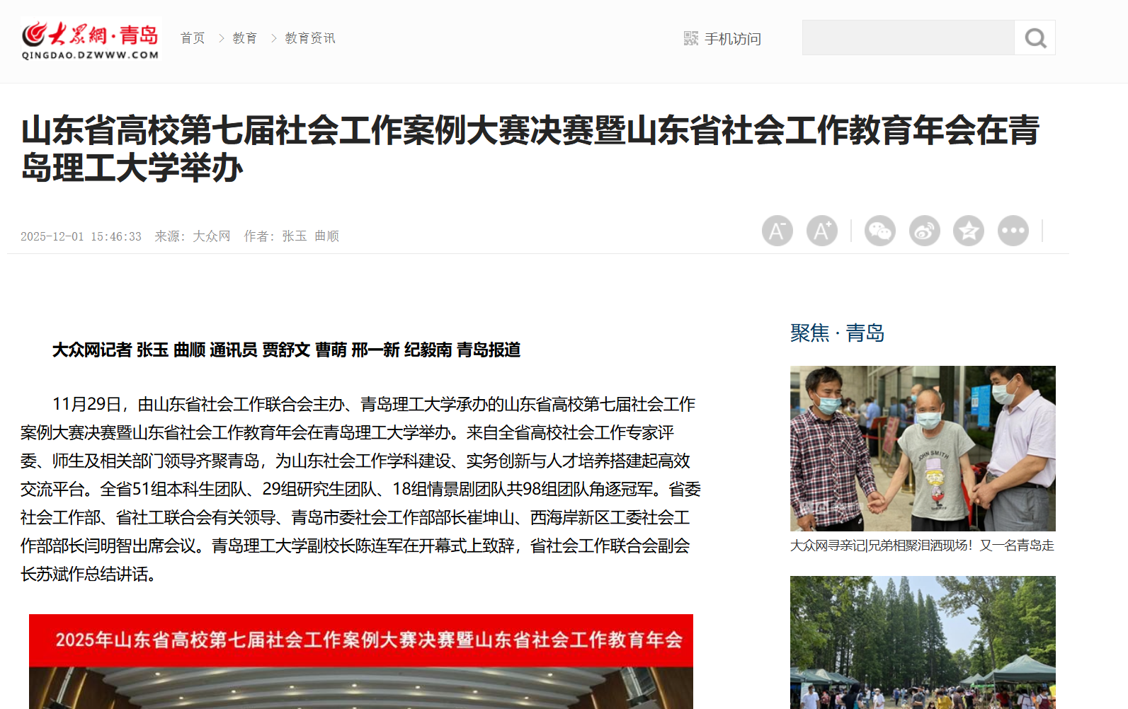 大众网:山东省高校第七届社会工作案例大赛决赛暨山东省社会工作教育年会在青岛理工大学举办